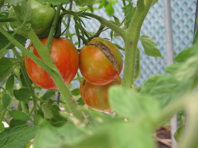 As you can see, the tomatoes I'm growing this year (Red and Green Zebra heirloom tomatoes) are very susceptible to cracks and scarring - nearly every single tomato I've picked is cracked. It's been raining a lot which doesn't help.